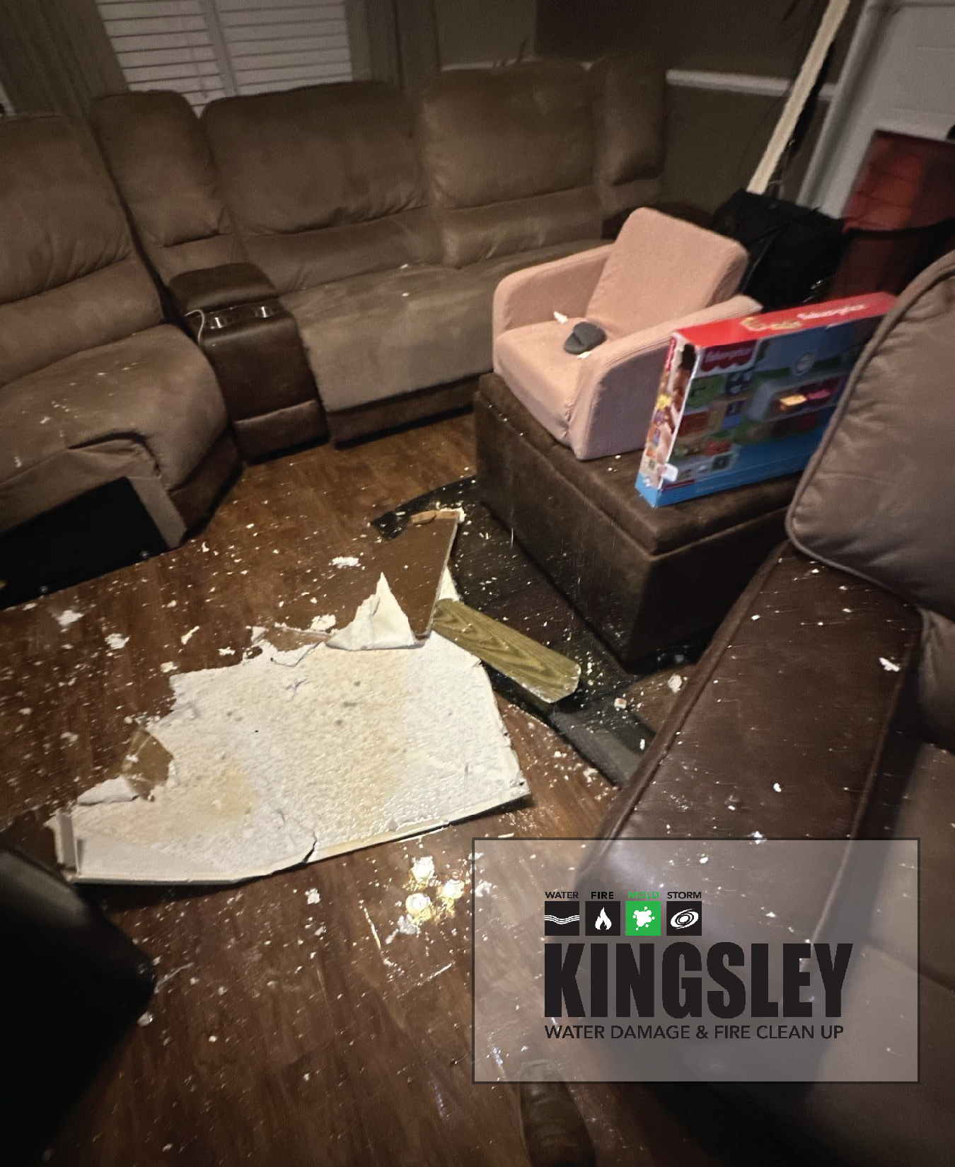 The structural damage from a broken pipe in a Goose Creek, SC, ceiling goes beyond just cleanup—it requires expert repair and reconstruction. Kingsley Water Damage and Fire Cleanup recently completed a full restoration project after a hidden pipe burst saturating the ceiling and seeped down, damaging the flooring below. Our certified team was called in to first remediate the moisture, using thermal imaging and industrial dehumidifiers to dry the subfloor, joists, and wall cavities to prevent mold. Once dry, we moved into the crucial repair phase, meticulously replacing the saturated drywall and seamlessly matching the ceiling texture and paint, making the leak invisible.